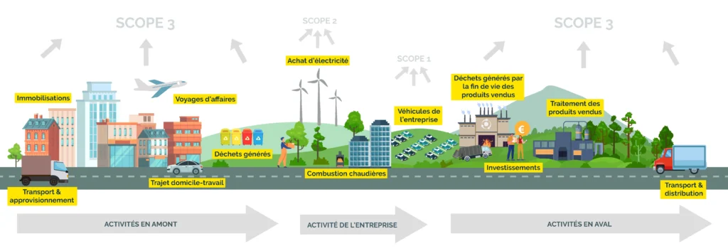 - Scope 3 : autres émissions indirectes (ex : déplacements des salariés, achats, déchets, transport des marchandises…)